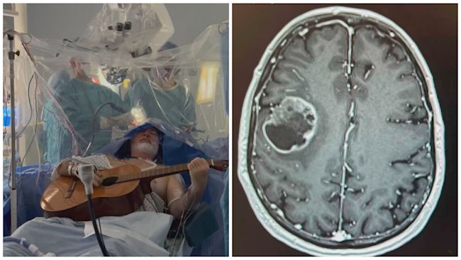 Amateur musician Colin Miller from Kent played the guitar while doctors removed a tumour in his brain the size of a golf ball.
