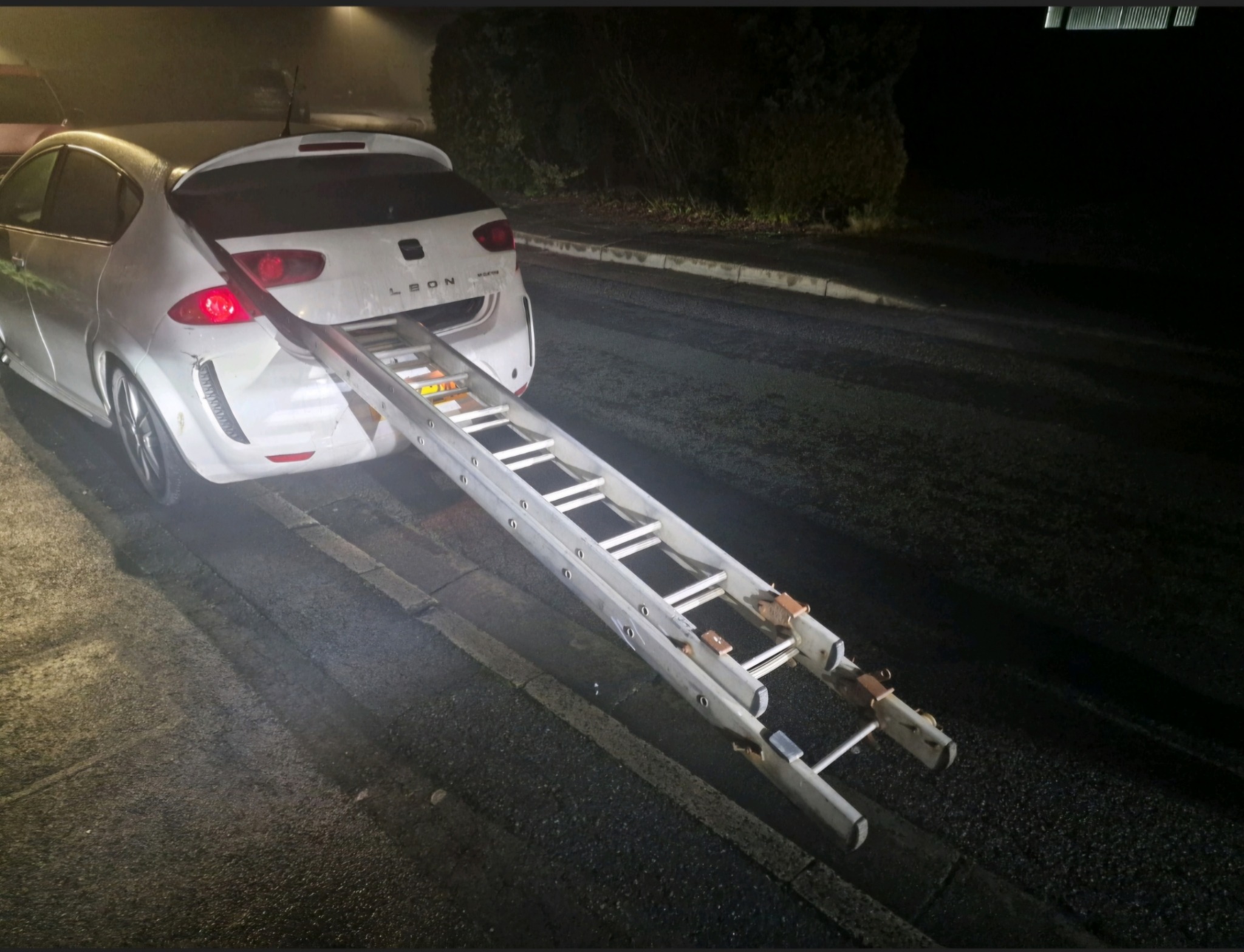 Police stopped this car after a motorist was spotted driving around with a huge ladder poking out of the back of his boot.